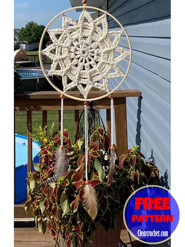 This wonderful star crochet dream catcher free pattern is with you. You will reach all the details such as which yarn and which hoop to use in the free crochet dream catcher pdf pattern below. A beautiful crochet dream catcher that can be a great home gift is with you, friends. In fact, I think you should make it for your own home. It will look very nice on the balcony or on the window of your living room. It is a very nice home gift for those who love bohemian home accessories. Now, the free crochet dream catcher pattern is with you step by step. Another thing I should mention before I forget is that after the crochet dream catcher is completed, do not forget to decorate it with seashells, stones and beads.